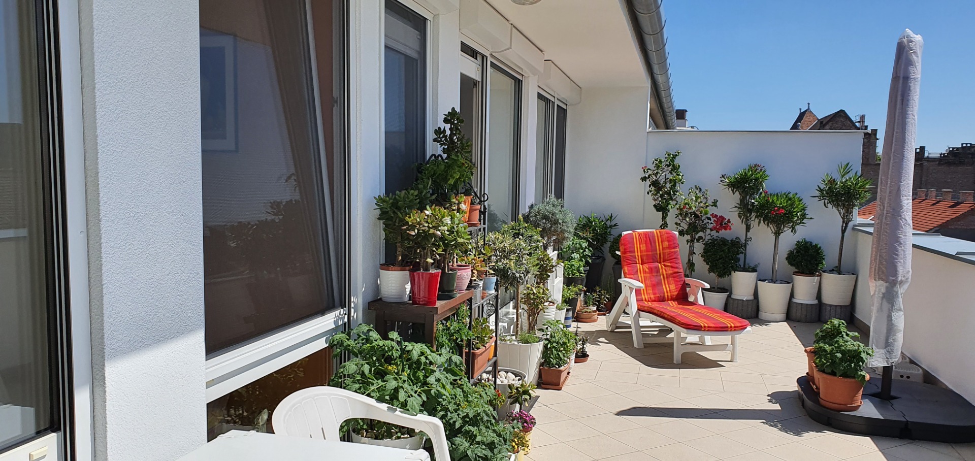 In der 5. Etage eines Wohnhauses mit Aufzug in der Nähe des Stadtteils Corvin befindet sich diese brutto 75 qm große 2-Zimmer-Wohnung mit großer Terrasse (32 qm) in Südlage mit vielen Extras (die auch einen 8-qm-Korridor für ausschließliche Nutzung und einen 12-qm-Lager umfasst).